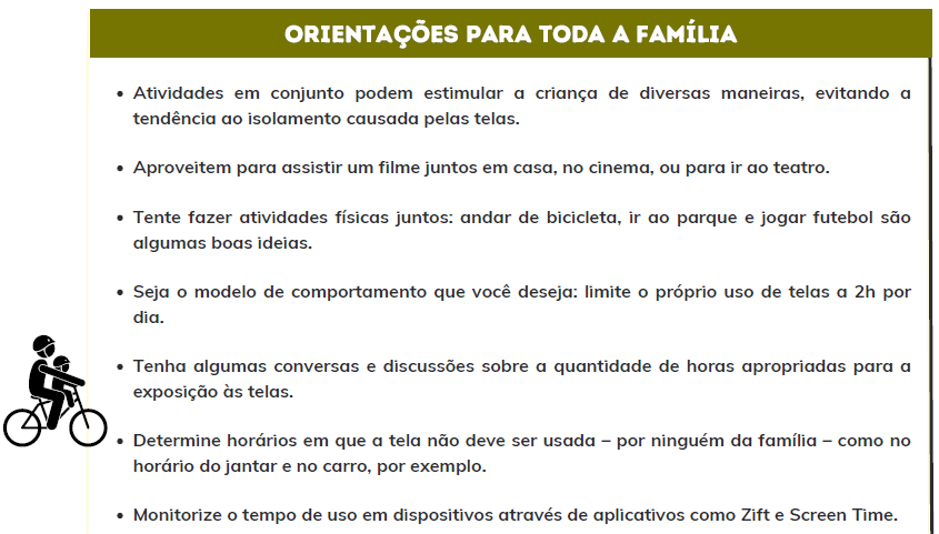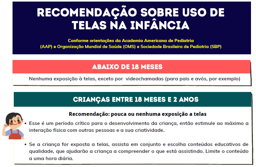 As tecnologias não são vilãs, são ferramentas que devem ser utilizadas com consciência e ética. Agora que você já conhece os severos danos que as telas podem oferecer para crianças de até 3 ou 4 anos e que o controle parental é determinante para uma boa saúde compartilhe esse texto com amigos para que eles também possam se informar. Mas o que podemos fazer para lidar com um mundo amplamente tecnológico e as inevitáveis exposições às telas? Muito bem, fique tranquilo pois a Sociedade Brasileira de Pediatria em conjunto com a OMS produziu uma cartilha de orientação para auxiliar pais e responsáveis! Verifique a cartilha ao final desse texto!!!