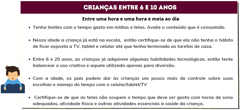 Vários estudos psicopedagógicos e neurocientíficos têm direcionado esforços para analisar a situação do acesso à telas na infância. Em 2019 foi publicado, no site da SBP (Sociedade Brasileira de Pediatria) um estudo que relata dez consequências negativas da exposição às telas para crianças de 0 a 3 anos. Logo, o uso de mídias digitais em um período fundamental de crescimento e desenvolvimento cerebral e mental é prejudicial e, portanto, não recomendam o oferecimento de telefone celular, smartphone e tablets como um “brinquedo” ou “distração”.